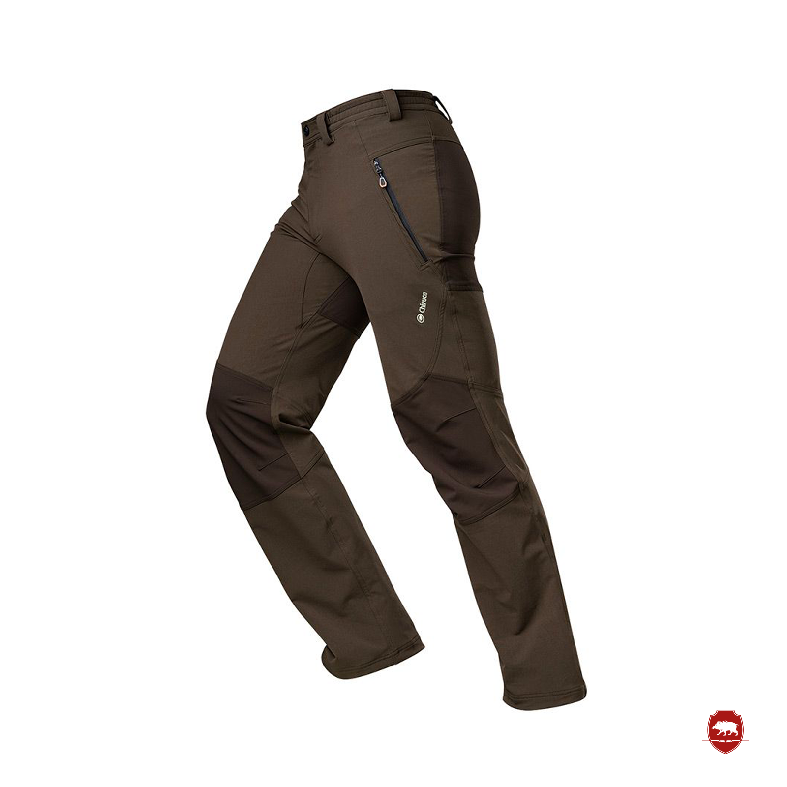 Pantalón outdoor elástico resistente con tratamiento de repelencia al agua. Patrón conformado de talle ajustado para optimizar la libertad de movimientos. Rodillas y trasero en color contrastado.